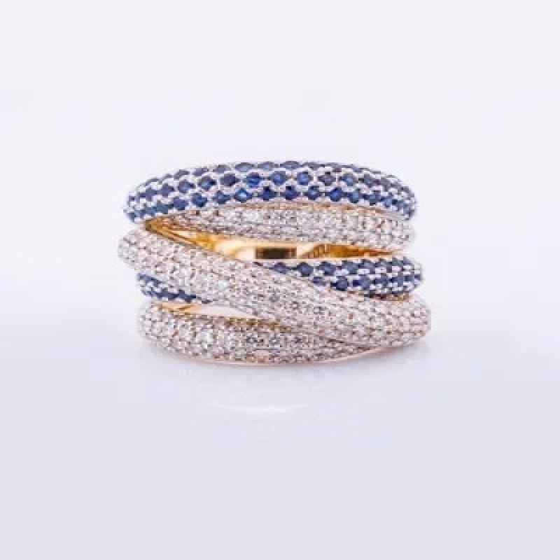 Женское кольцо из желтого золота 585 пробы с натуральными бриллиантами и сапфирами. Характеристика изделия: вес 13 г, 125 круглых натуральных бриллиантов - 1.88 ct 4/5А,  108 сапфиров - 1,94 ct. Значение веса и характеристик являются усредненными и могут незначительно отличаться от фактических. Наши ювелирные изделия проходят процедуру опробования и клеймения Российской государственной пробирной палатой. Пробирное клеймо нанесено с помощью лазерной гравировки. Каждому изделию присвоен УИН (уникальный идентификационный номер), который наносится на ярлык маркированных ювелирных изделий. По нему Вы можете получить достоверную информацию о ювелирном изделии на официальном сайте Российской государственной пробирной палаты. Бриллианты проходят независимую геммологическую экспертизу в лаборатории МГУ. Украшение приходит в комплекте с фирменной упаковкой: футляром для ювелирного изделия, фирменным пакетом и небольшим комплиментом. Мы работаем для Вас с 2007 года.